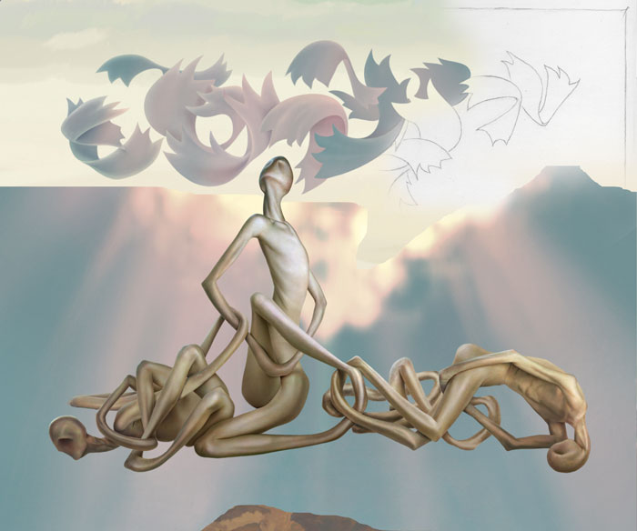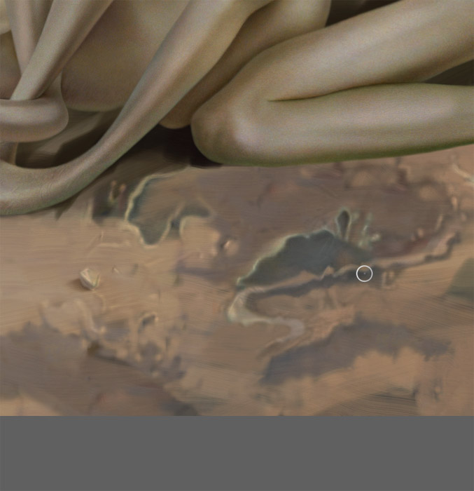 визуально меня все устраивает, перехожу к земле, непосредственно под «ногами» моих фигур. Как уже говорил, моя задача сделать землю материальной, а более точное слово – показать материальность земли, т.е. изобразить землю землей, а не.. ммм.. киселем, железом, пластилином и т.д… Хотя.. в данном случае все решает идея – сегодня моя идея.. в прострации, но пластилин меня никак не устроит, поэтому рисую землю. Почему рисовать, а не использовать, например фото земли, с фактурой, падающим соответственно светом и т.д..? Да бог его знает.. Возможно, потому, что так может любой дурак, а мне.. как то не положено упрощать)) У меня только одна дорога – вперед и выше!))
