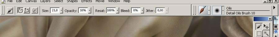В этом слое, буду стараться зарисовать свои рельефные мазки. Для этого мне понадобится кисть Oils/Detail Oils Brush 10 с примерно такими вот параметрами