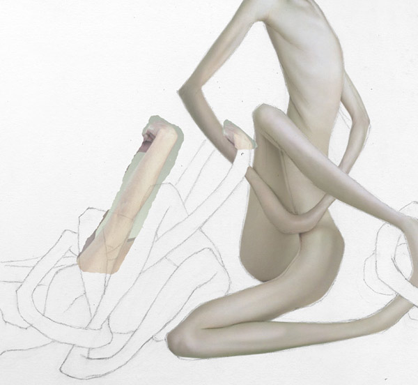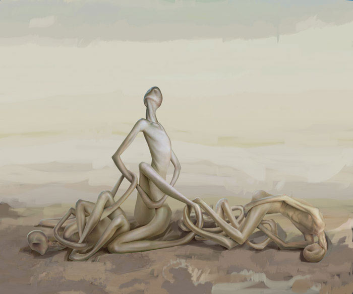 Сейчас я должен повторить все предыдущие действия в Painter с землей. Это меня утомляет, даже несмотря на мою природную моральную устойчивость в таких ситуациях.. Поэтому я решил переместить свои действия не только на землю, но и уже на фигуры. Я дорисовываю оттенки на телах. И так как работаю в отдельном слое, меня не особо заботят мелкие погрешности. Я все это поправлю в конце..
