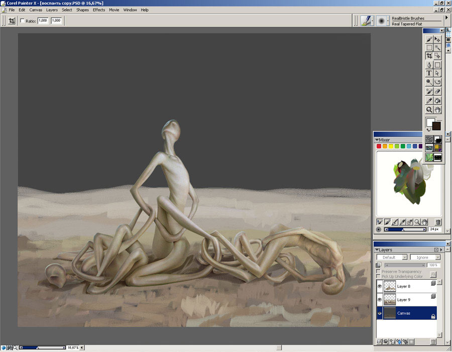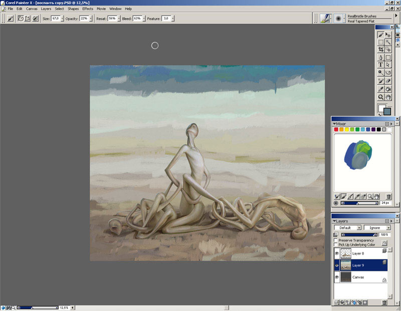 И так, я переношу картинку в Corel Painter, создаю отдельный слой и с помощью кисточки (RealBristle Brushes), просто малякаю что придется..)